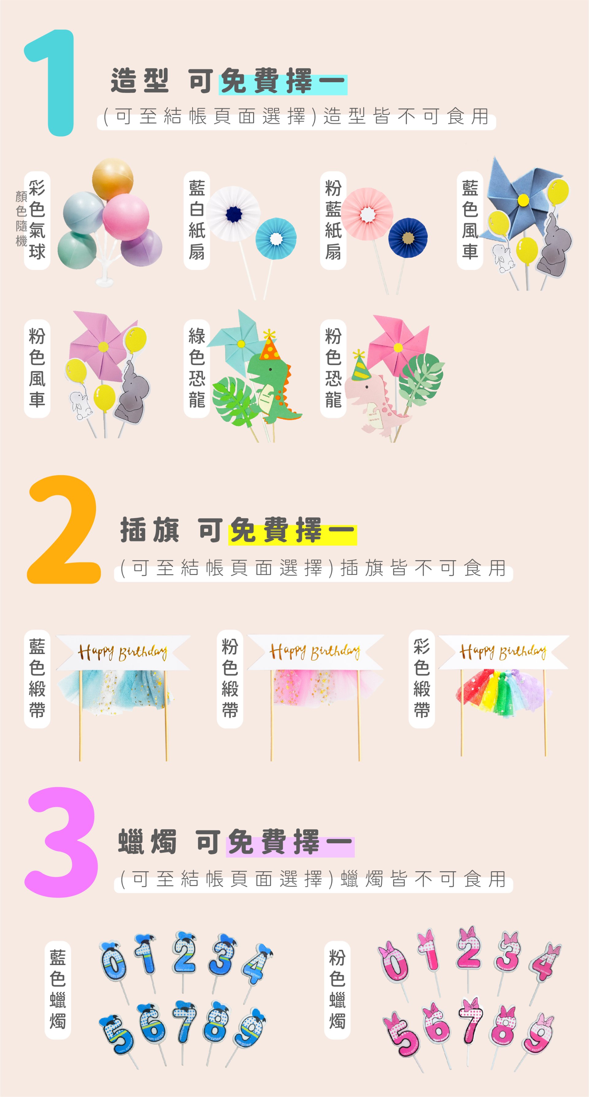 另外上面的裝飾品也很有彈性地提供六種不一樣的款式讓你選擇,甚至Happy Birthday的插牌及蠟燭也有不一樣的色系讓你挑選喔!